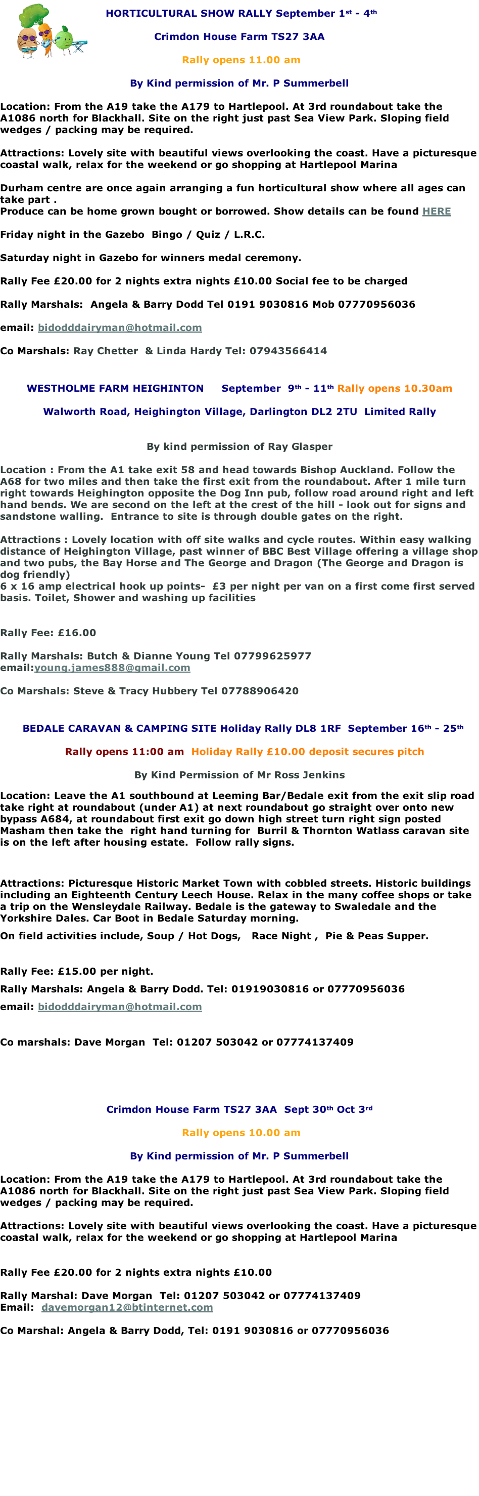 Please check the website before you travel as it will be updated if a Rally has to be cancelled or opening times changed.